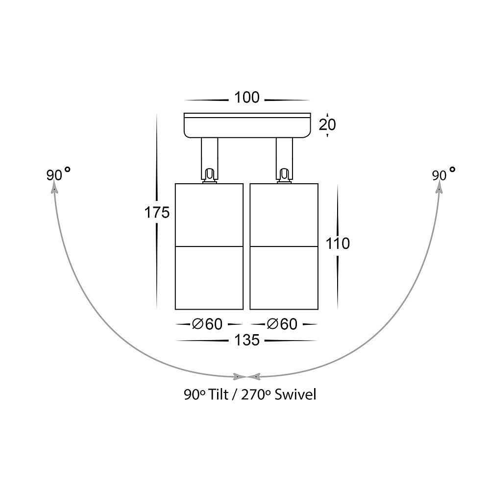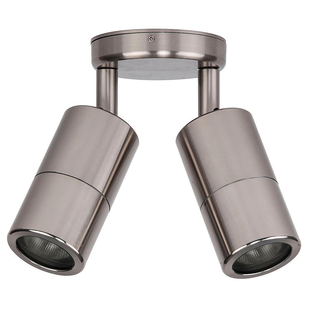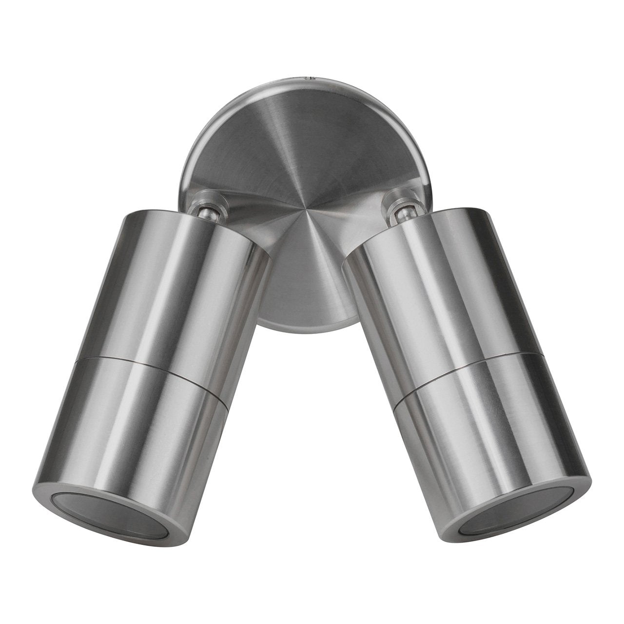 Modern double adjustable spot exterior light in Silver coloured Aluminium. Includes a matching aluminium backing plate and high output reflector to maximise light. 90 degree Tilt and 270 degree swivel on both heads.